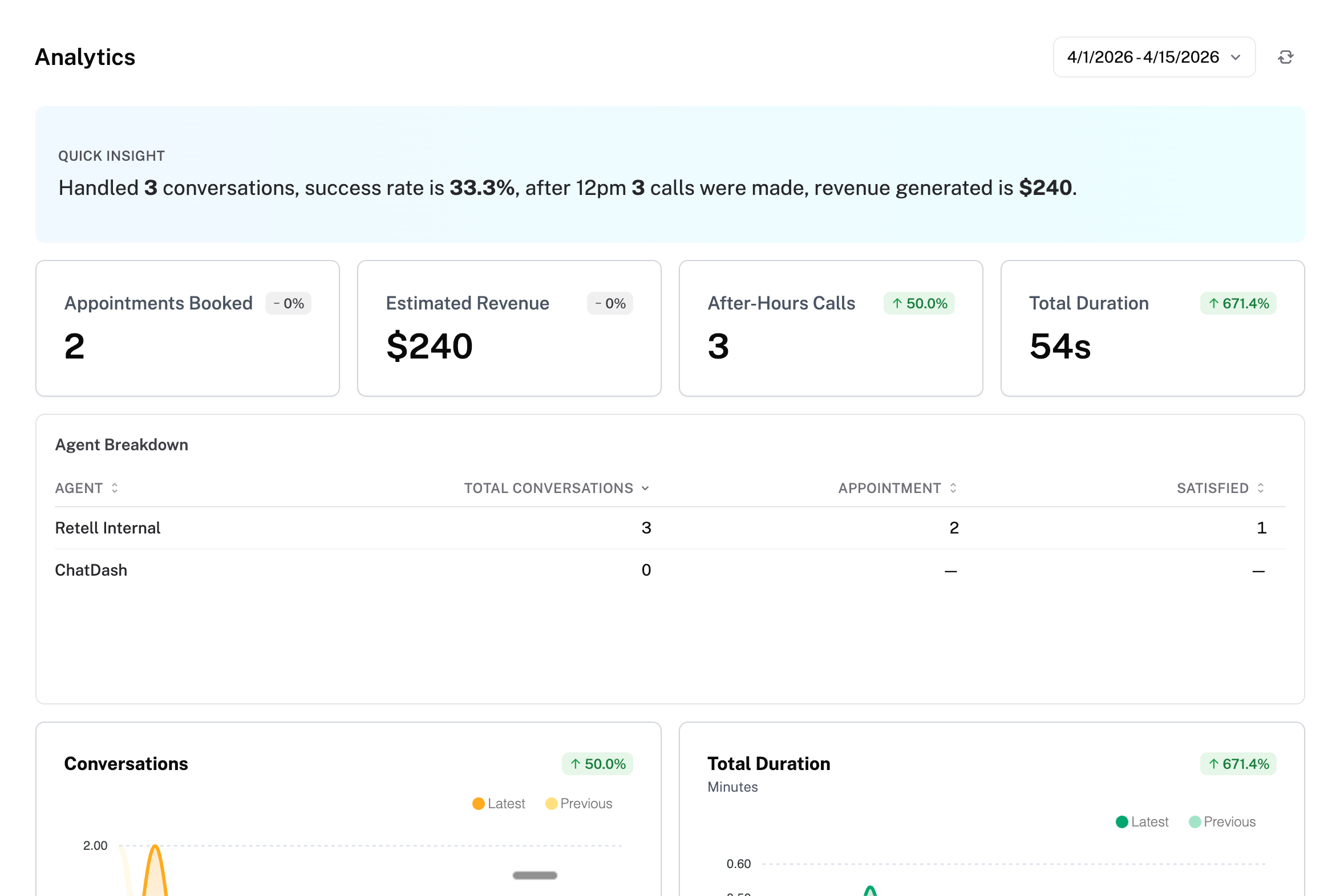 Agent Breakdown Tables — side-by-side comparison of every agent's performance with columns you choose (conversations, call duration, success rate, custom values, and more)